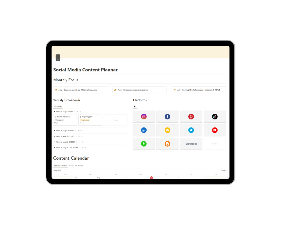 This template has everything you need to make your life easier! With monthly focuses, goals, demographics, content pillars, content calendar, idea bank and individual social platform strategies, you'll have everything you need to plan and schedule engaging content that resonates with your audience.